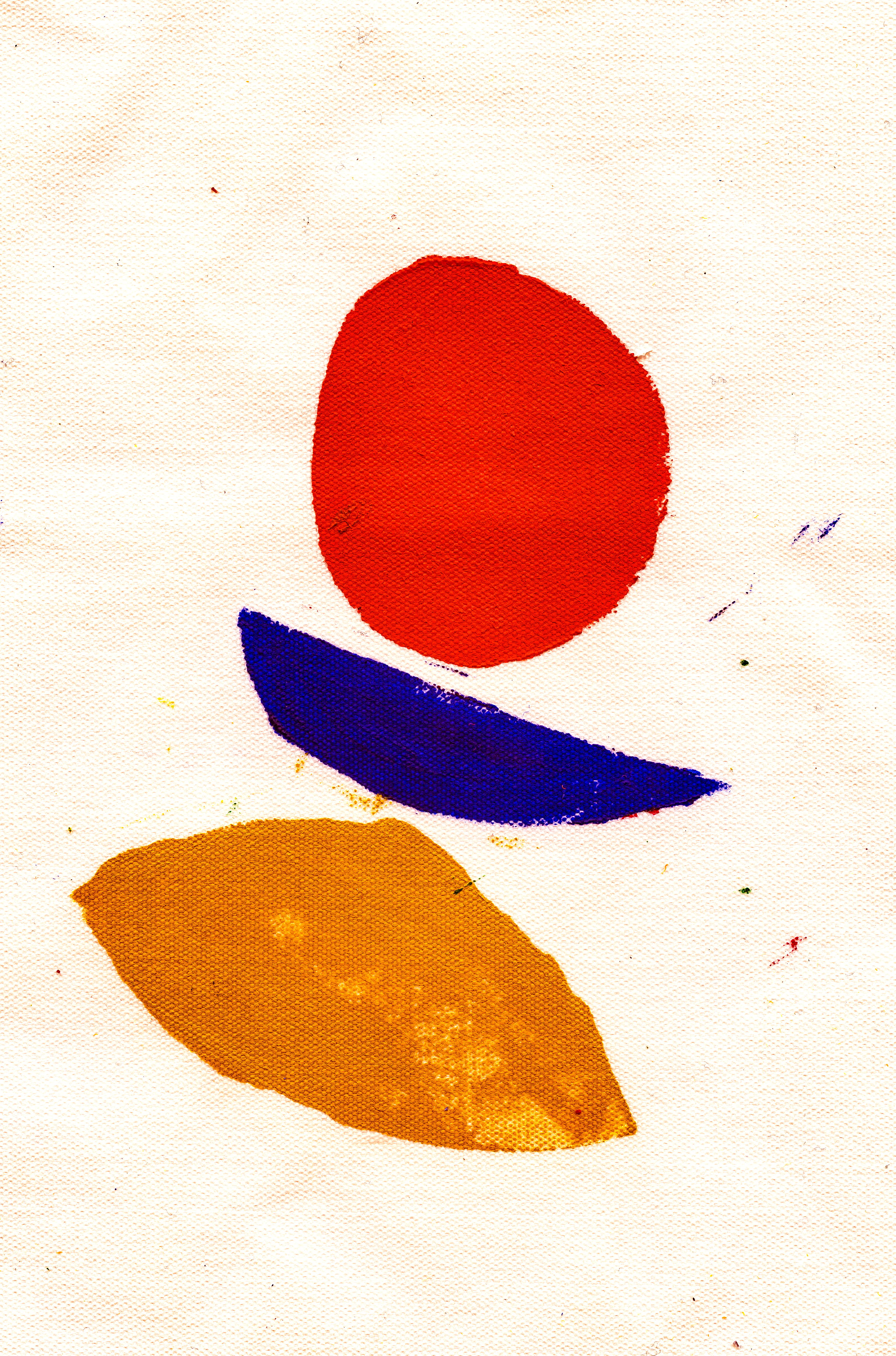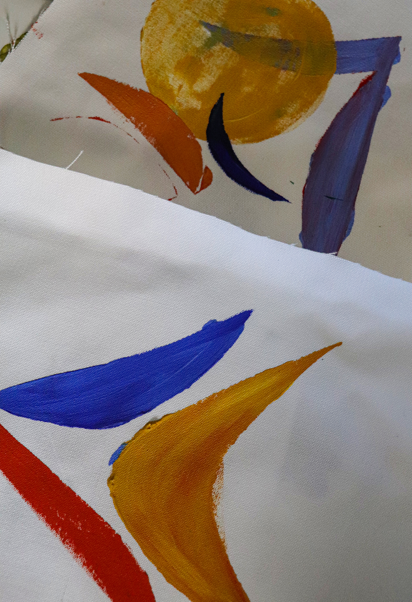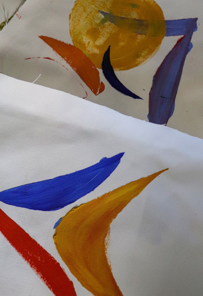 We painted shapes onto sail cloth using acrylic paint and pure pigment. The paint shapes bled onto the sail cloth and in some cases produced a raised effect – creating depth, texture and a more organic feeling to the work. The contrasting shapes felt as though they were floating and also conveyed a sense of collision, interruption and movement while feeling strangely connected.